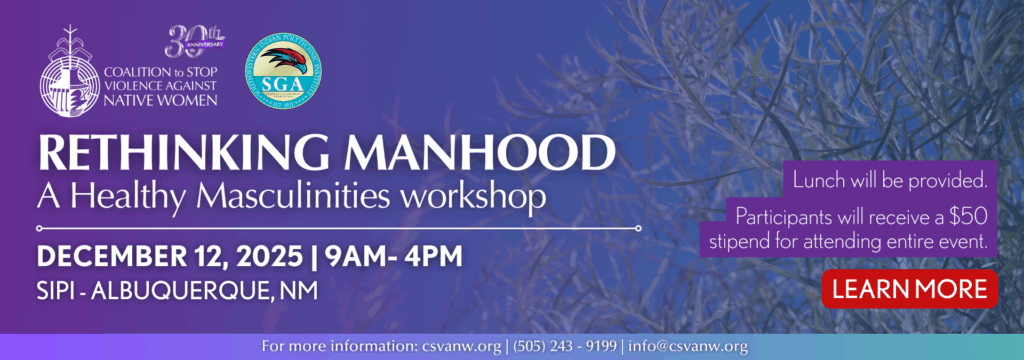 Organized in 1995 by three founding Native women, Peggy Bird (Kewa), Darlene Correa (Laguna Pueblo), and Genne James (Navajo), the Coalition to Stop Violence Against Native Women (CSVANW) was created to provide support to other Native advocates working in domestic violence, sexual assault, dating violence, stalking, and sex trafficking in New Mexico’s tribal communities. Read More >>>